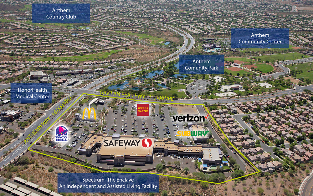 Anthem Marketplace supports the Anthem community Safeway, McDonald’s, Taco Bell, Wells Fargo, Midfirst Bank, Quality Interactive Montessori Daycare, Barros Pizza, Foothills Sports Medicine, Verizon, T-Mobile, Subway, Baskin & Robbins, Leslie Pools, Great Clips, PostNet, State Farm Insurance, Edward Jones to name a few. The center thrives from the variety of dining, retail, and service tenants. There are restaurant, medical, and salon spaces available
