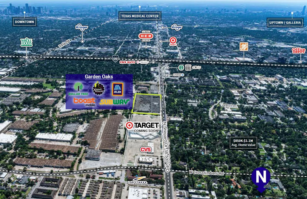 Located in the heart of one of Houston’s fastest-growing high-income communities, and soon to be shadow-anchored by a new 129,490 square foot Target store, Garden Oaks Shopping Center offers an exceptional retail ecosystem for any business seeking high visibility, strong traffic, and prime connectivity to both affluent neighborhoods and major employment hubs. The sustained surge of new residents with strong purchasing power has driven substantial catalytic commercial development, allowing retailers to capitalize on a customer base that is actively seeking new shopping, dining, and service options.