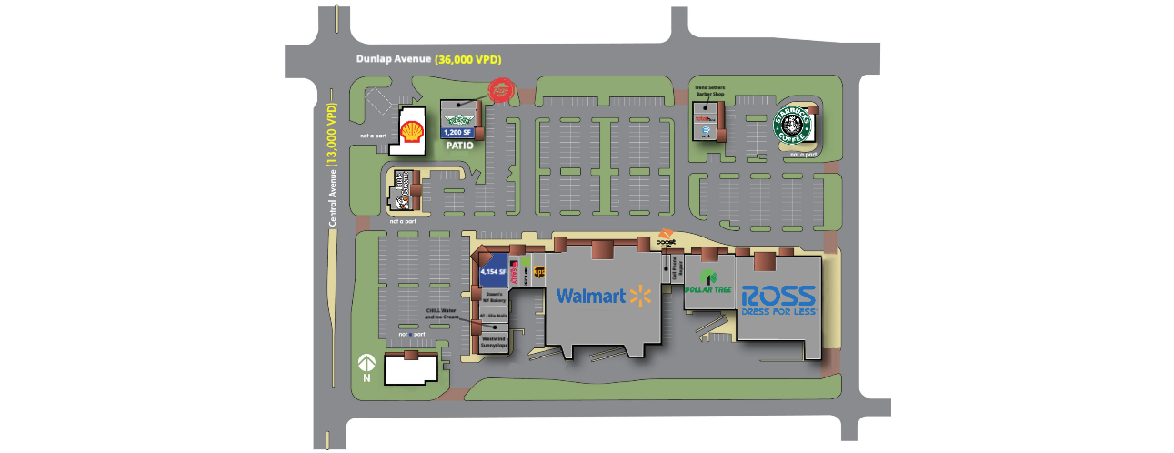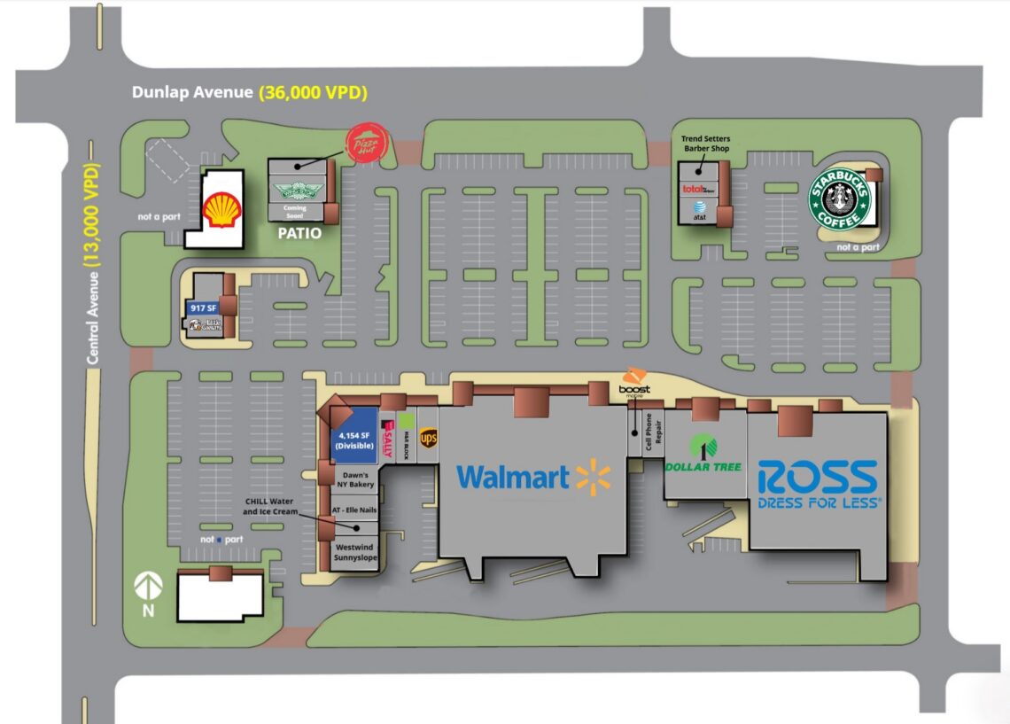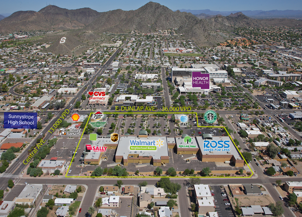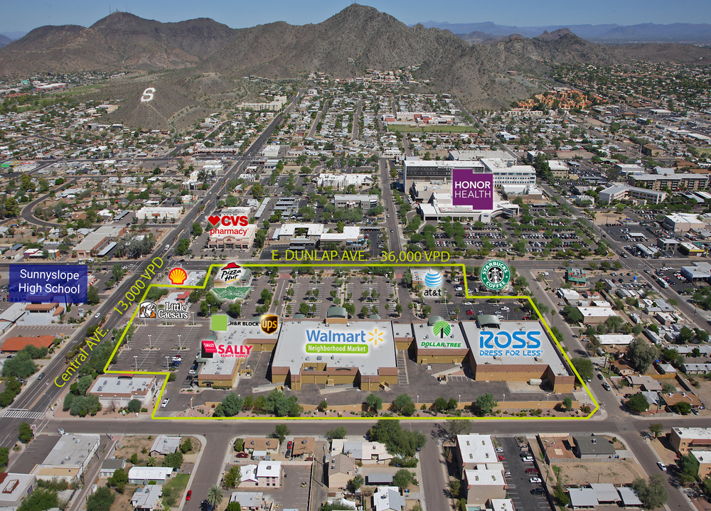 The Sunny Slope Community in the heart of North Central Phoenix lies in Market Place at Central, a high-density, high-traffic, vibrant retail destination that pulses with energy. Anchored by retail giants such as Wal-Mart Neighborhood Market, Dollar Tree, and Ross Dress for Less, this center serves as a focal point for both locals and visitors alike. The bustling atmosphere is further amplified by the steady stream of foot traffic, drawn from the nearby Sunnyslope High School and Honor Health Hospital. As students, staff, and medical professionals flow through the area, the Market Place at Central thrives as a bustling hub of activity.