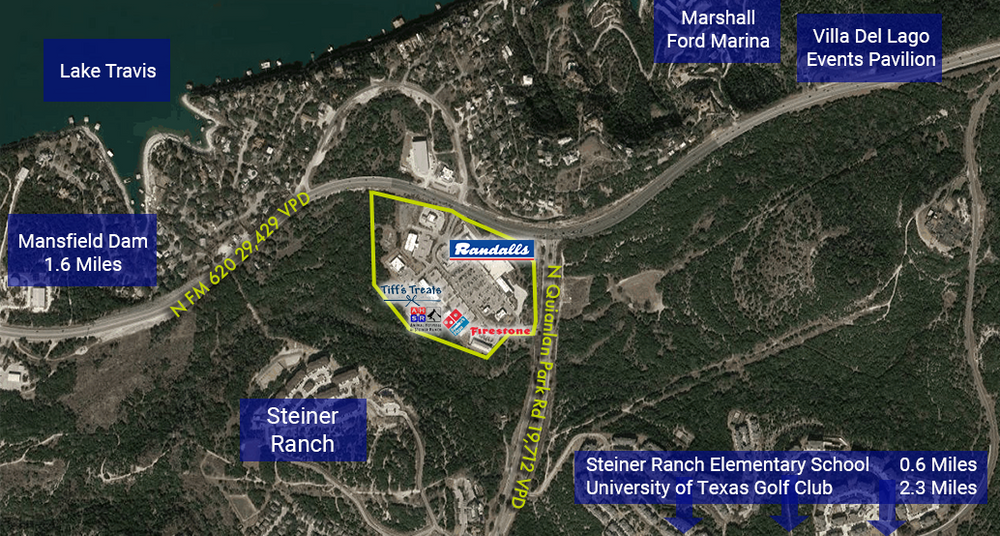 Quinlan Crossing is located between Lake Austin and Lake Travis at the main entrance of the upscale and affluent Steiner Ranch master-planned community, which is home to The University of Texas Golf Club.
